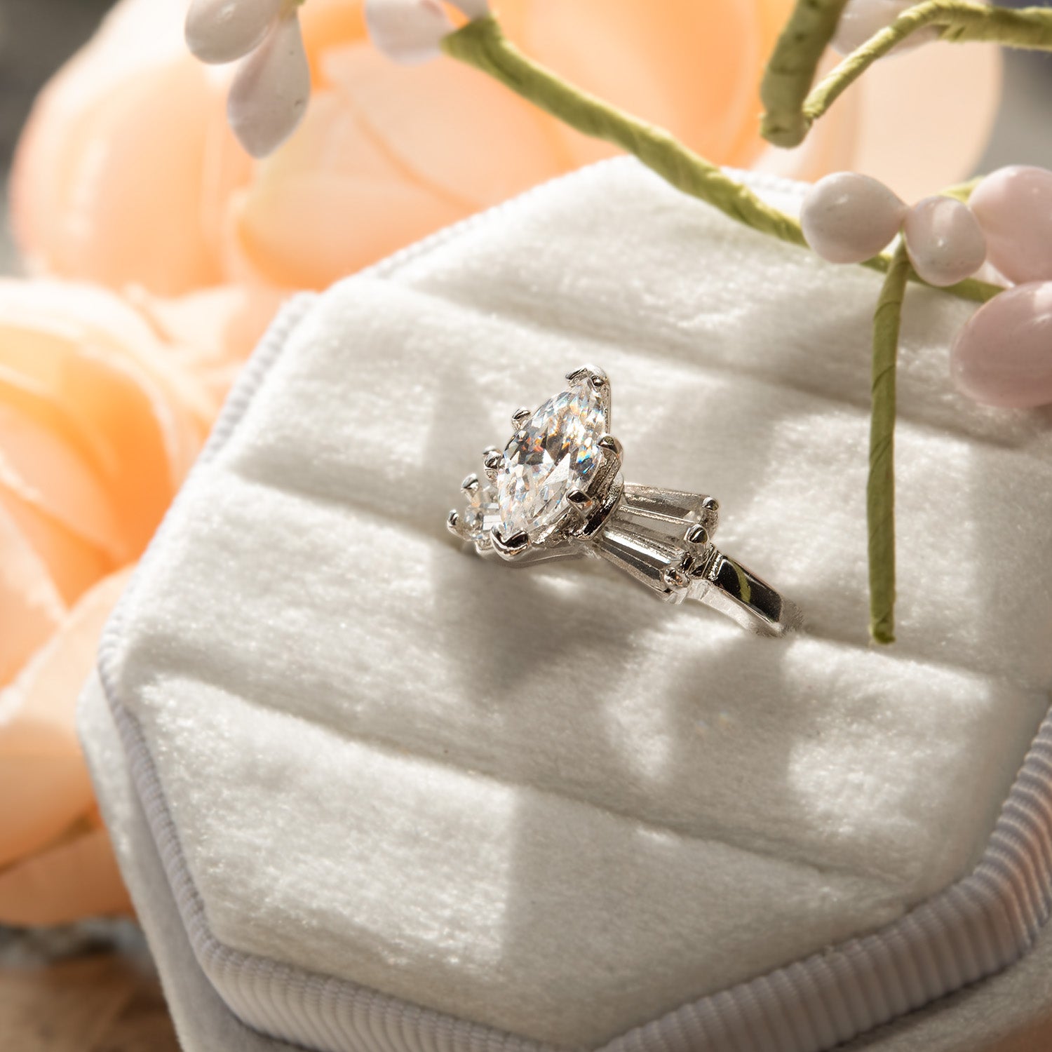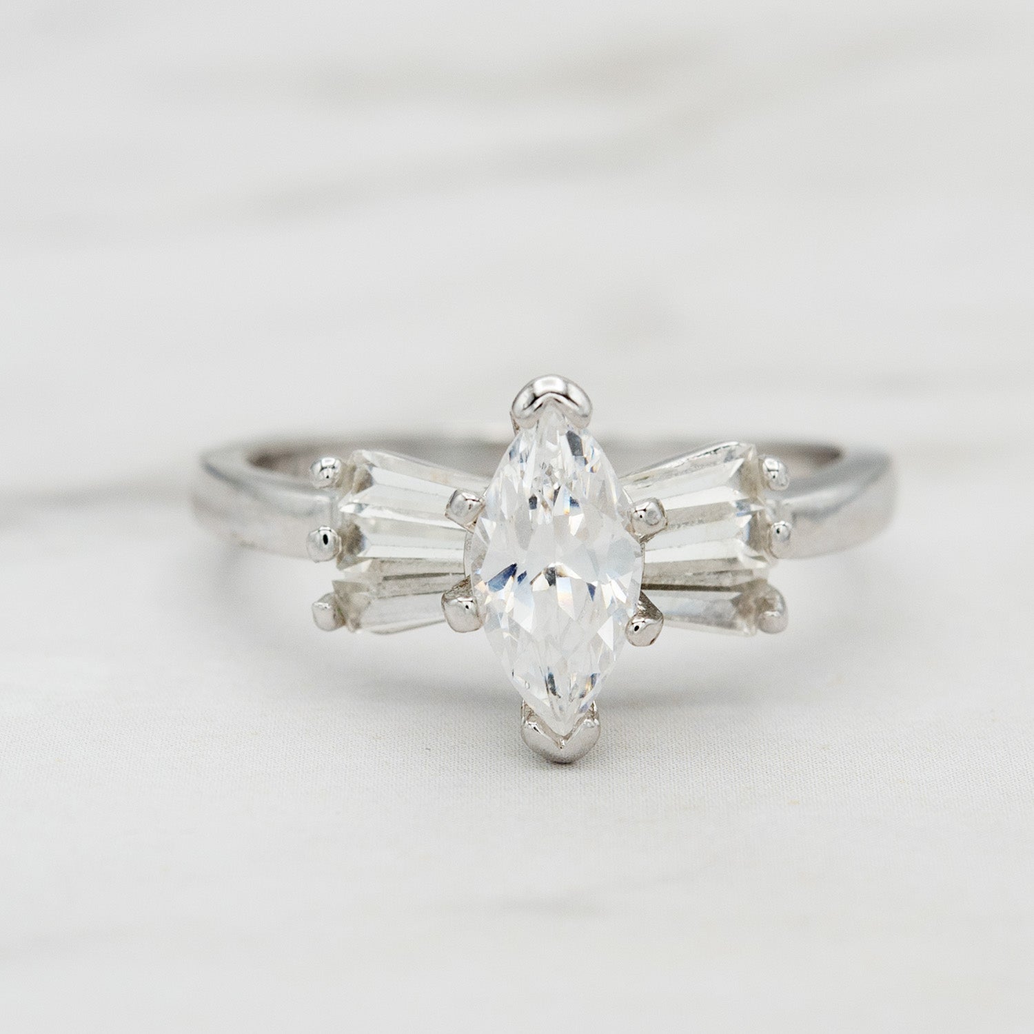 Vintage 1980's 18k White Gold Plated Marquis Shaped Cubic Zirconia Engagement Style Ring Made in USA