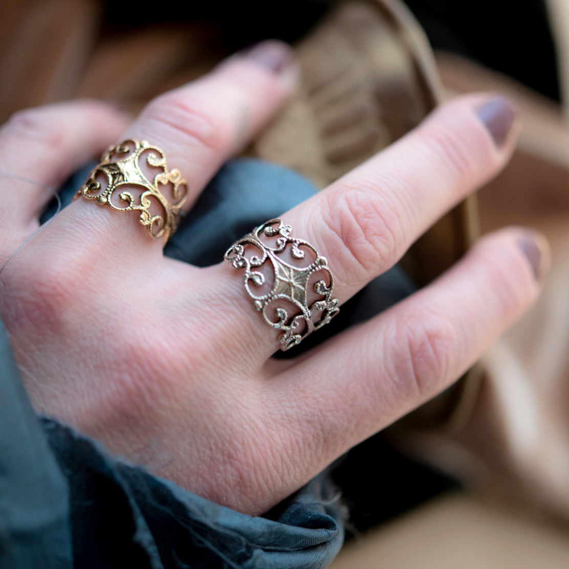 These rings cannot be sized. Plated jewelry of any type that has base metals in the core cannot be sized. This is because the metals in the core of the ring are softer than the gold on the outside, and would melt if cut and resized. But there are some tricks to make a size up work – we suggest applying a few coats of clear nail polish to the inside of the ring. It helps it fit more snugly while also helping to prolong the life of the plating… so it’s a win/win!