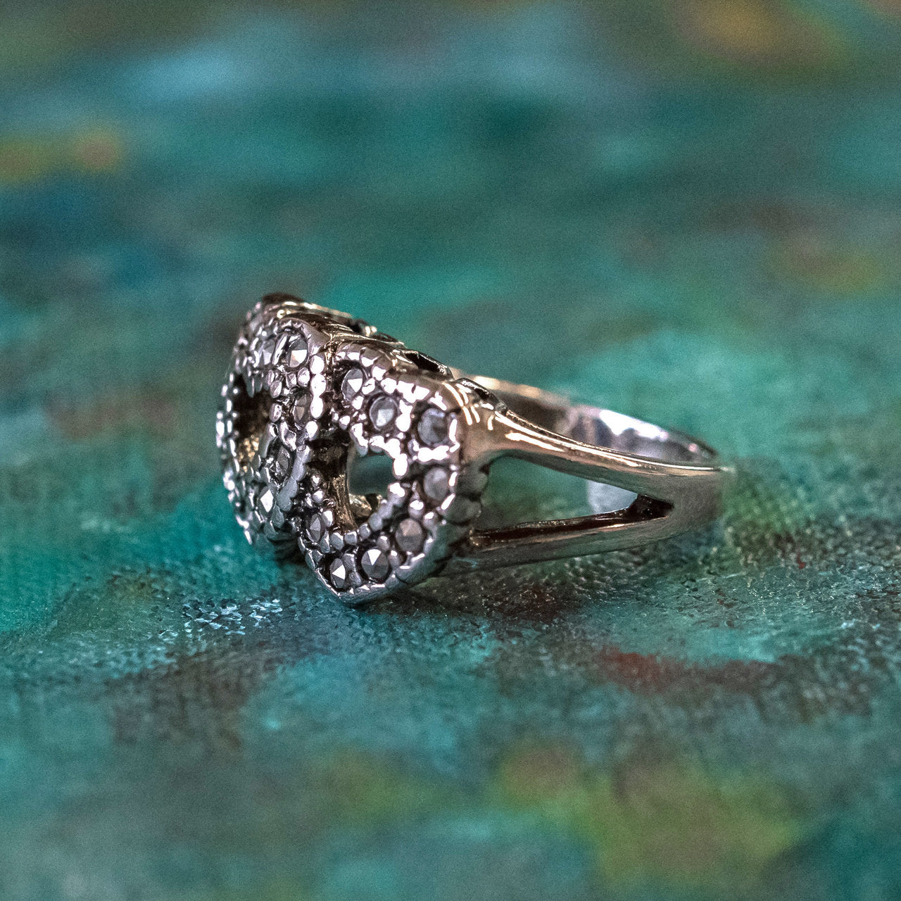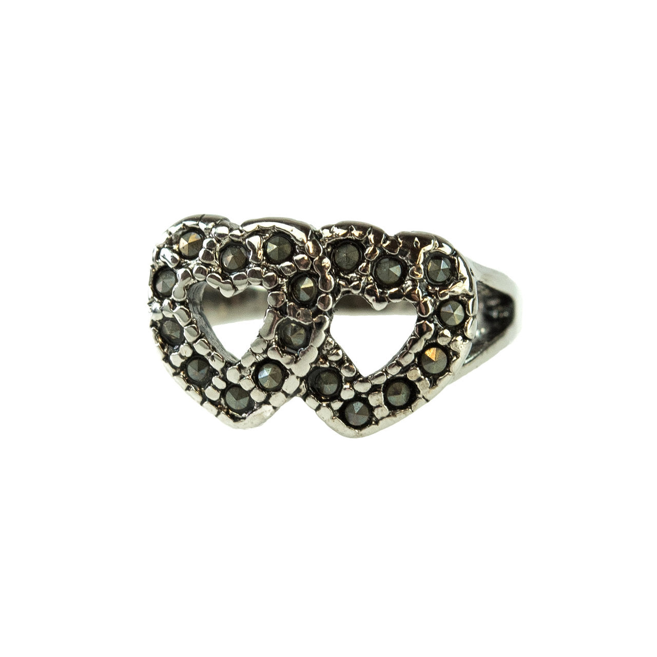 Vintage Ring Genuine Marcasite Double Heart Ring Antique 18k White Gold Silver Antique Womans Jewelry R1758 Size: 6