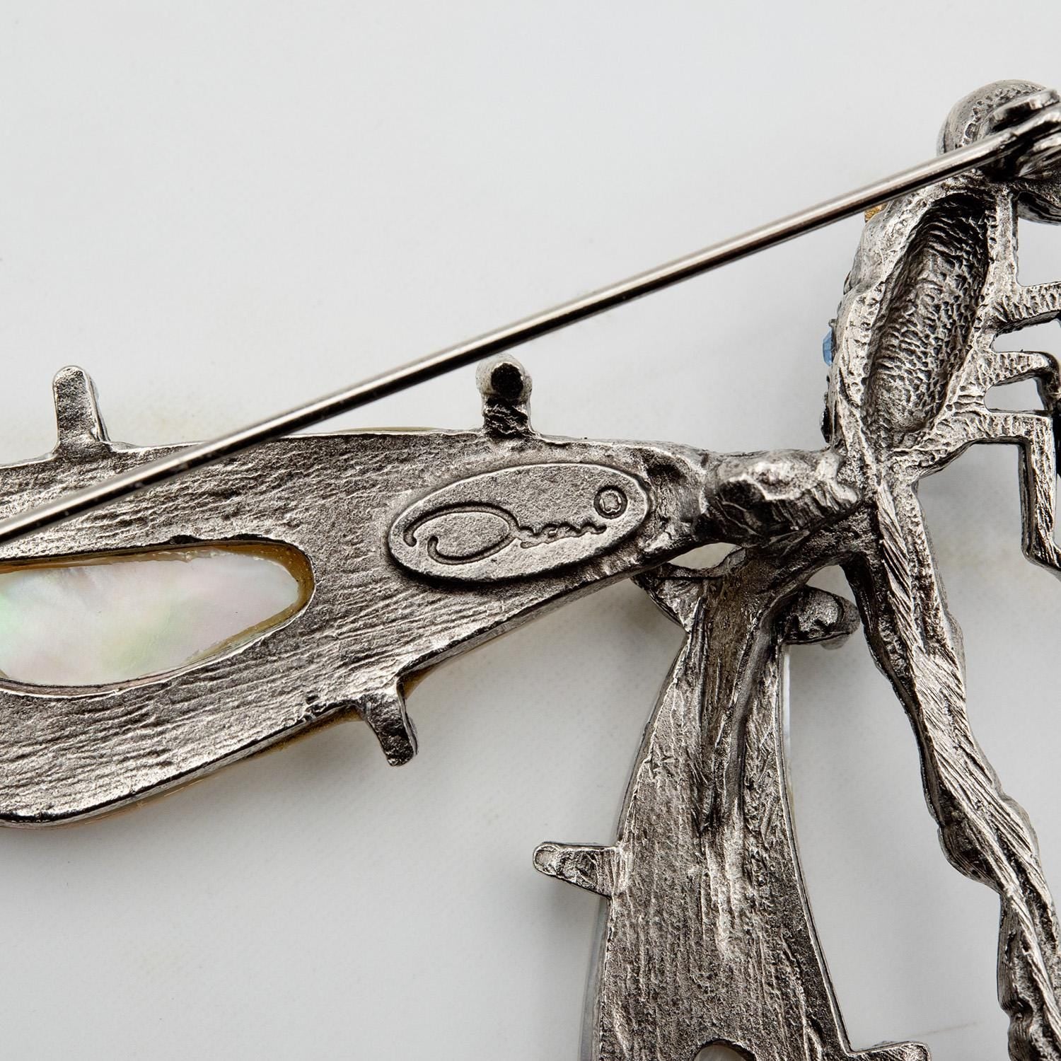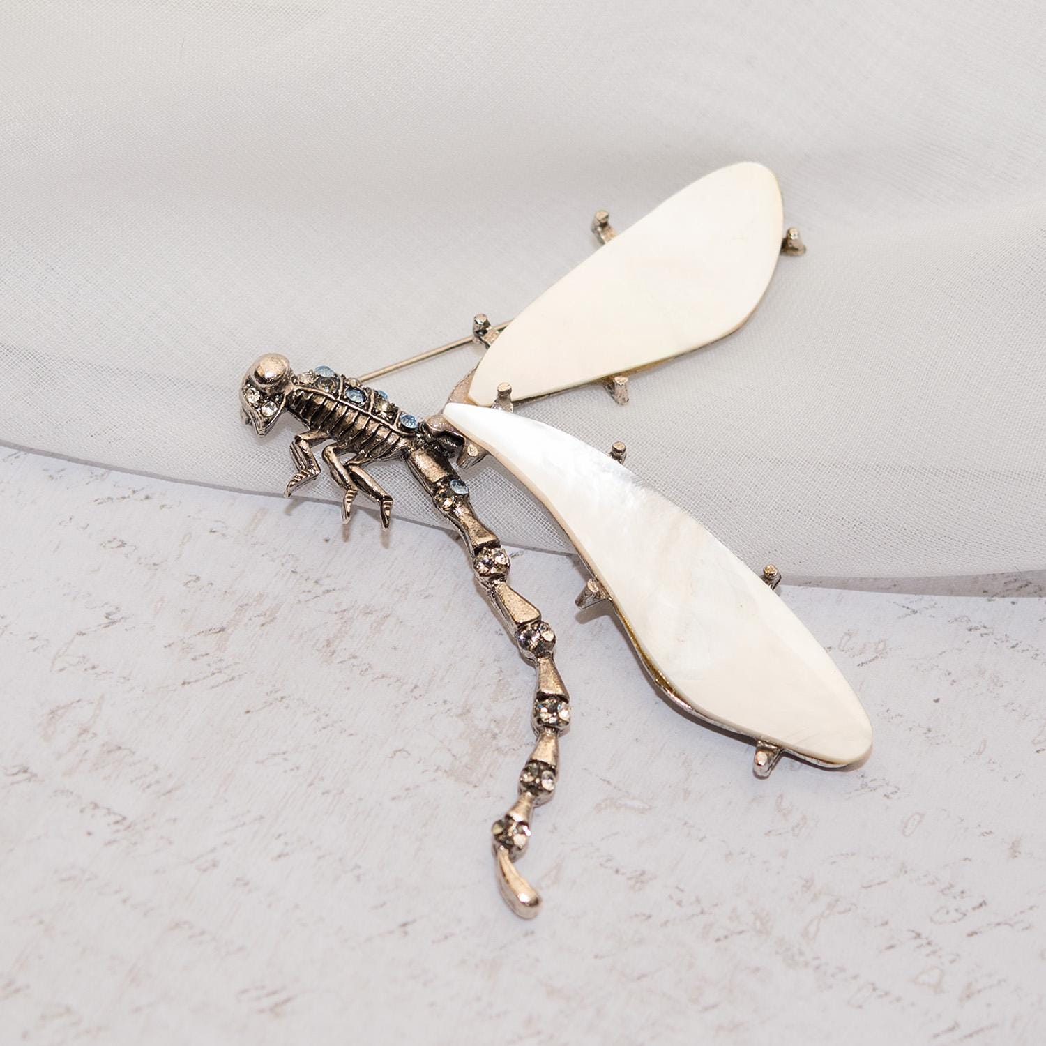 Vintage Oscar de la Renta Mother of Pearl Dragonfly Brooch Antiqued White Gold Pin with Mother of Pearl Wings
