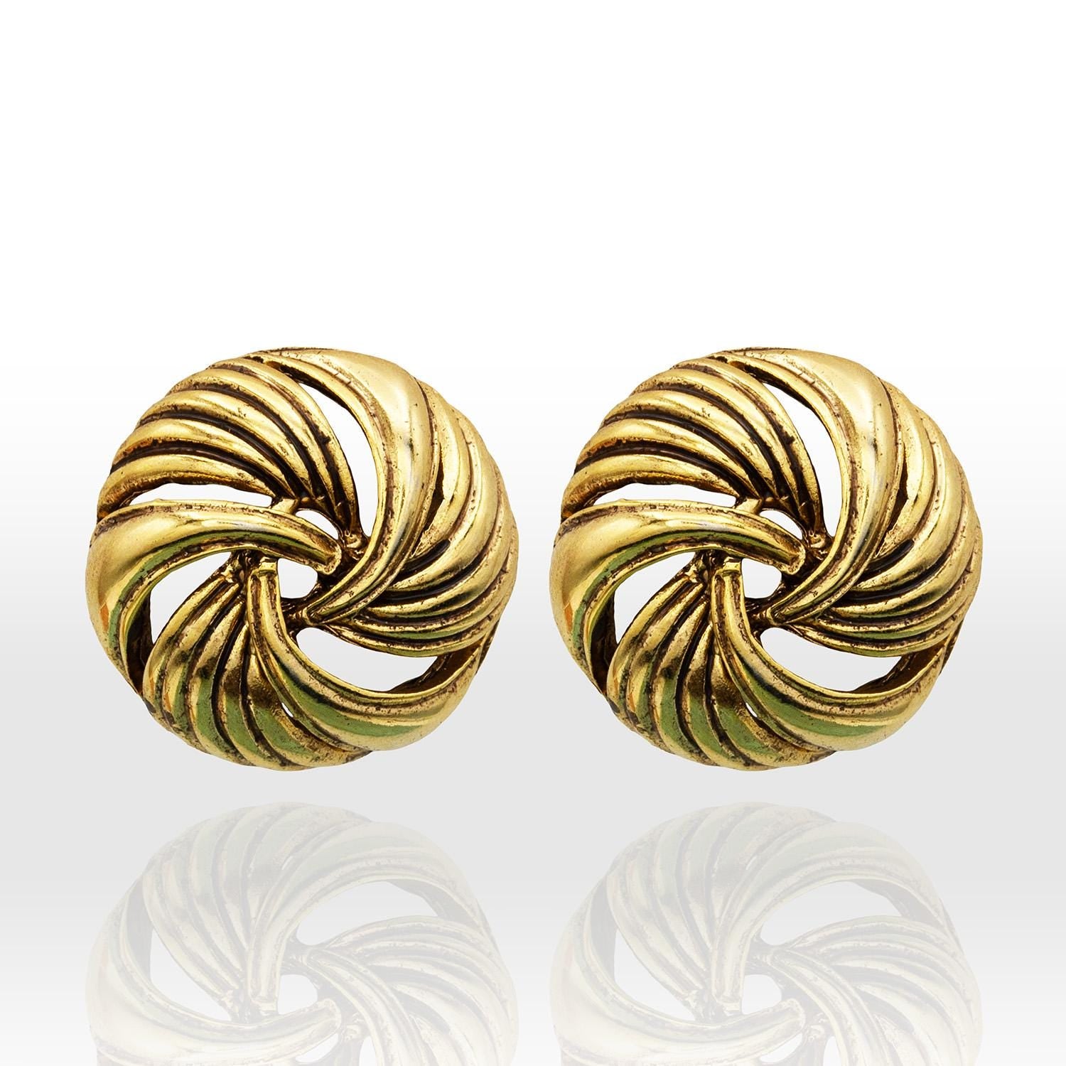 Vintage Oscar de la Renta Womens Button Earrings Gold Plated Pierced Post Statement Swirl Design Antique Designer Jewelry for Women Signed
