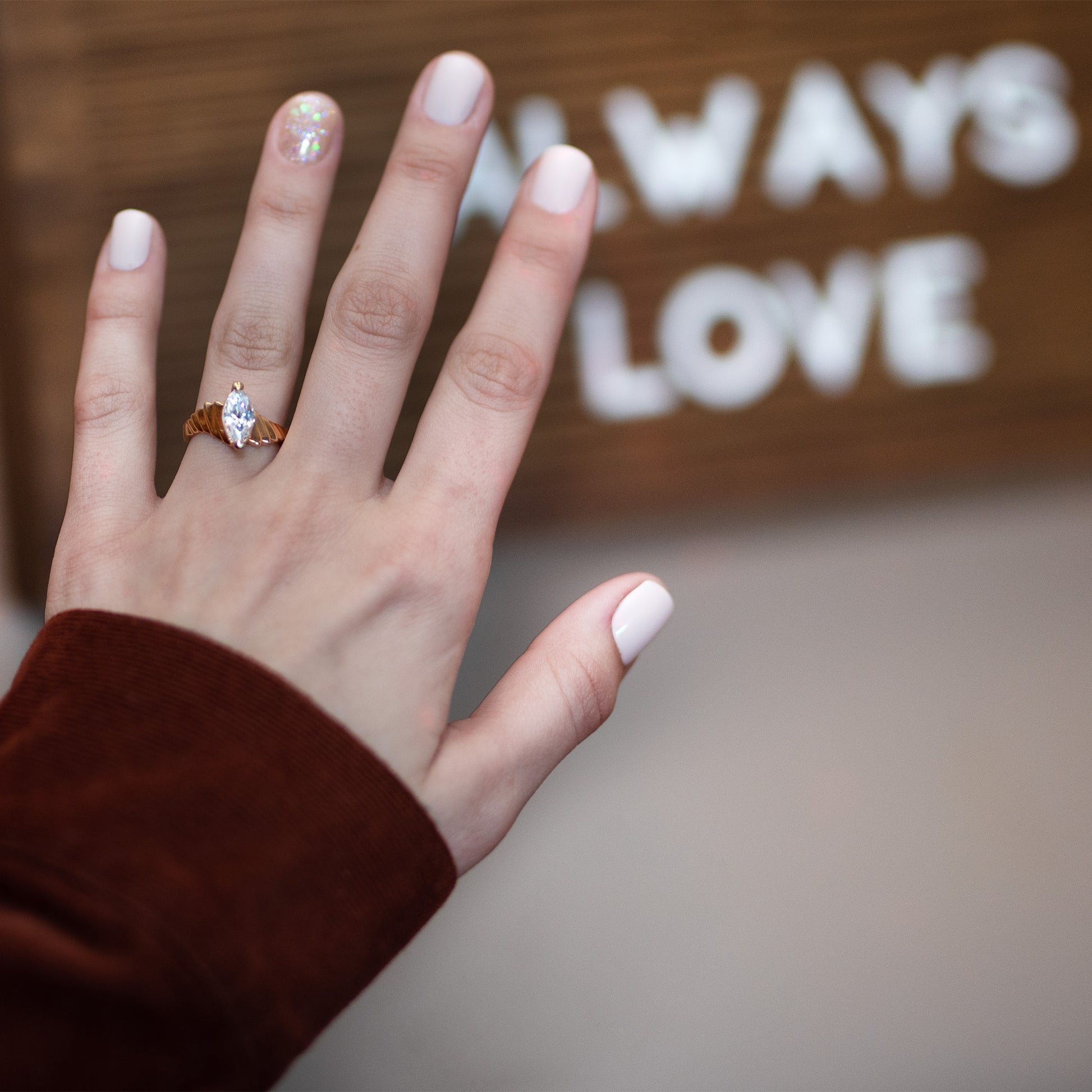 These rings cannot be sized. Plated jewelry of any type that has base metals in the core cannot be sized. This is because the metals in the core of the ring are softer than the gold on the outside, and would melt if cut and resized. But there are some tricks to make a size up work – we suggest applying a few coats of clear nail polish to the inside of the ring. It helps it fit more snugly while also helping to prolong the life of the plating… so it’s a win/win!