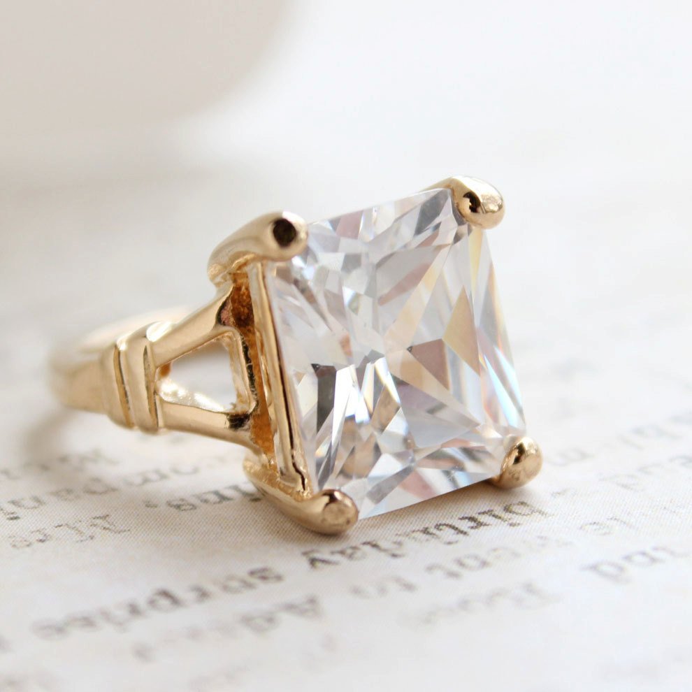 Vintage Ring Emerald Cut Emerald Austrian Crystal 18kt Gold Electroplated Ring Made in the USA
