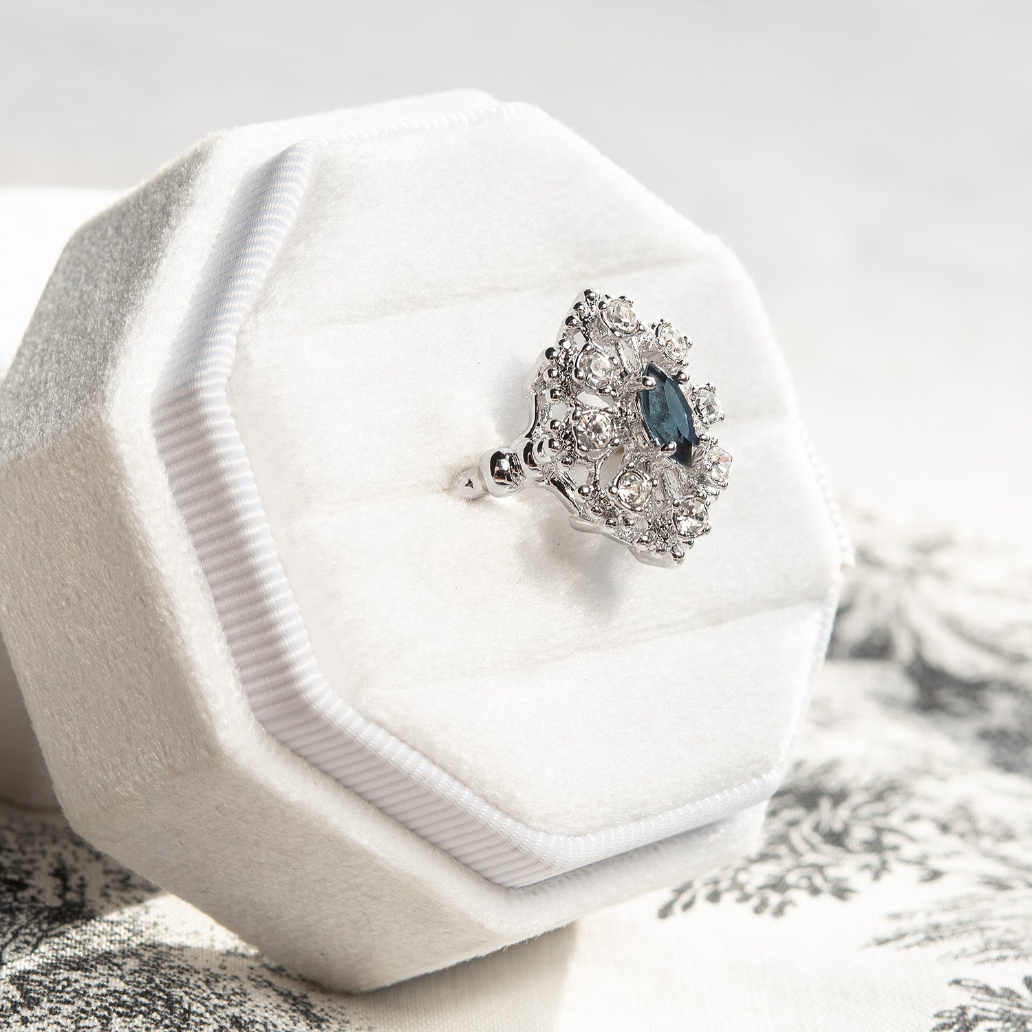 This stunning vintage ring with a Sapphire Austrian Crystal measures 3.8mm X 7.8mm is approximately 1.25 ct. and surrounded by Pinfire Opals. Set in antiqued 18kt yellow antiqued gold setting. Stones are hand set in prong setting.  Wear this ring on any finger and we know you will absolutely love it as much as we do.  All our rings are stamped with 18kt HGE and all are made in America. This is a perfect birthstone ring for the girls who is a September baby and loves vintage jewelry.